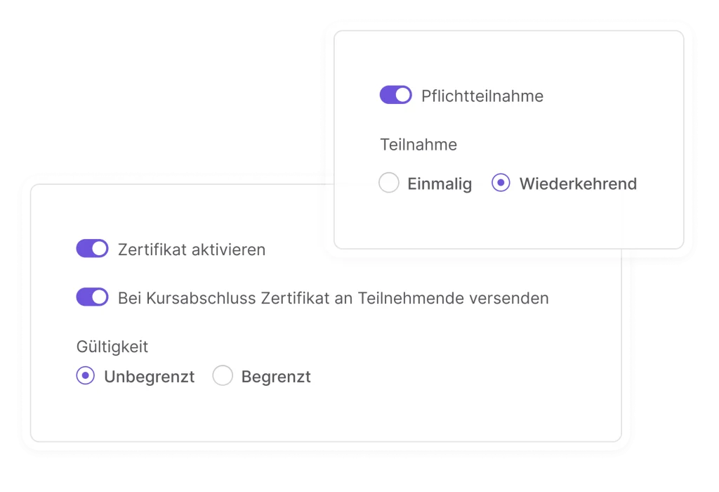 Funktionen, die Ihr Lernen erleichtern Mit den innovativen Funktionen von reteach gestalten Sie Ihre Schulungen und Unterweisungen intuitiv und effizient. Lernplattform Gestalten Sie Ihre eigene Lernplattform nach individuellen Wünschen, erstellen Sie mit wenigen Klicks Kurse in verschiedenen Formaten und profitieren Sie von KI im Bereich Wissensabfrage. Akademiegestaltung Responsive Design Inhalte der Akademie sind optimiert für alle Endgeräte, was Zugänglichkeit von überall gewährleistet. Whitelabel Branding Keinerlei Branding-Elemente von reteach, sondern vollständige Anpassung an die visuelle Unternehmensumgebung. Zertifikate Automatisierte Erstellung individueller Zertifikate, anpassbar in verschiedenen Designelementen wie Logo und Hintergrund. Individuelles Design Ermöglicht Anpassung der Kurs-Homepage an Ihr Corporate Design, einschließlich Logo, Farben und Schriftarten. Intuitives Design Einfache Verwaltung der Akademie und Lernen durch benutzerfreundliche Oberfläche. Wunschdomain Betrieb der eigenen Akademie auf einer selbstgewählten Domain mit sicherem SSL-Zugang. Individuelle Kursgestaltung Präsenzschulungen Digitale Bereitstellung von Informationen zu Ort und Zeit der Veranstaltung, Erinnerungsfunktionen und Verwaltung von Anwesenheitslisten. Live-Webinare Integration von Live-Webinaren über Plattformen wie Zoom und Microsoft Teams mit automatisierten Prozessen, einschließlich Termineinladungen. Unterstützung weiterer Plattformen möglich. On-Demand Schulungen Bereitstellung von Online-Kursen, die es Teilnehmenden ermöglichen, unabhängig von Zeit und Ort zu lernen. Verschiedene Medientypen unterstützen die flexible Gestaltung der Lerninhalte. Blended Learning Kombination von Präsenz- und Onlineformaten für flexibles, hybrides und kohortenbasiertes Lernen. Kurserstellung Lernerfolgskontrollen Erstellung von Quizzes nach Lernlektionen zur Überprüfung des Wissensstands, Sicherung der Lernqualität und Förderung eines interaktiven Lernerlebnisses. Video-Kursproduktion aus Ihren Textdateien Automatisierte Konvertierung umfangreicher textbasierter Dateien (Doc, PDF, PPT) in kurze Videoformate, um Trainings verständlicher, attraktiver und sprachlich flexibel bereitzustellen. Standardkurse individualisieren Ergänzung vorgefertigter Compliance-Trainings um firmeneigene Informationen, um ein vollständig angepasstes Lernangebot ohne zusätzliche Kurse zu ermöglichen. Kursstruktur & Kommunikation Pflichtlektionen Einrichtung obligatorischer Lektionen, um sicherzustellen, dass Teilnehmende bestimmte Einheiten abschließen, bevor sie weiterfahren. Zeitgesteuerte Veröffentlichung Zeitliche Planung der Veröffentlichung für Kurse und Lektionen sowie Festlegung wiederkehrender Termine für Live-Formate. Lernpfade Organisation und Kombination von Live- und On-Demand-Kursen in definierten Reihenfolgen zur Steigerung des Lernerfolgs. Content-Hierarchien Strukturierte Gliederung der Inhalte in Kurse, Kapitel und Lektionen zur Optimierung der Übersichtlichkeit und Steigerung des Lernerfolgs. Keine Limits Unbegrenzte Kapitel und Lektionen, keine Beschränkung der Administratoranzahl und unbegrenzter Datenspeicher für Inhalte. Kommentarfunktion Ermöglicht es Teilnehmenden, Fragen in einem Kommentarbereich zu stellen und fördert den Austausch innerhalb der Lerngemeinschaft. Medien & Formate Embed-Code Lektionsformat Ermöglicht die Einbettung von Anwendungen wie Articulate Rise 360, Miro, Mural, und Google Forms via iFrame in Lektionen. Powerpoint Einfache Einbindung von Powerpoint-Präsentationen aus Microsoft 365, inklusive aller Multimedia-Elemente, zur schnellen Kursentwicklung. Kurse integrieren Einfache Integration bestehender Kurse in SCORM oder H5P Format, sowie Einbettung von Cloud-Formaten wie Online PPT, Slideshare, Sway, oder Canva. Bilder & Videos Unterstützte Bilddateiformate: JPG, PNG, TIFF, GIF, SVG und WEBP Unterstützte Videodateiformate: MP4, MPEG, WEBM mit einer maximalen Dateigröße von 10 GB. Drag & Drop Intuitiver Kursaufbau und einfache Bedienung beschleunigen die Kurserstellung. KI-Unterstützung Quiz-Erstellung Erstellung von Quizzes nach Lernlektionen zur Überprüfung des Wissensstands, Sicherung der Lernqualität und Förderung eines interaktiven Lernerlebnisses. Weiterer Einsatz Wir arbeiten im Hintergrund stetig an neuen Einsatzmöglichkeiten für KI. Datenschutz & Sicherheit DSGVO-Konformität Hoher Datenschutz und Datensicherheit mit Servern in Deutschland, um DSGVO-Anforderungen zu erfüllen. Automatischer Cookie-Banner Integrierter, anpassbarer Cookie-Banner auf der Akademie-Homepage, der den Einsatz externer Software überflüssig macht. Auftragsdatenverarbeitung Schließen Sie mit uns eine Vereinbarung über die Auftragsdatenverarbeitung ab – auf Wunsch auch individualisierbar. Verwaltung Verwalten Sie Admins und Teilnehmende intuitiv, behalten Sie dank Analytics den Überblick über den Lernfortschritt und managen Sie einfach verschiedene Integrationen. Admin & interne Rollen Referenten Ermöglicht das einfache Einladen von Gast-Referenten oder Lektoren, inklusive der Hinterlegung von Bild, Biografie und Social-Media-Profilen in Kursen. Admin-Verwaltung Verwaltung der Administratorberechtigungen, Zuweisung spezifischer Rollen und Rechte zur Steuerung des Daten- und Bereichszugriffs. Adminbereich in 2 Sprachen (deutsch, englisch) verfügbar. Newsfeed Aktualisierungen und Ereignisse innerhalb der Akademie, wie Kurskäufe, Abschlüsse und neue Kommentare, werden im Newsfeed für Admins sichtbar. Teilnehmerverwaltung Login ohne E-Mail-Adresse Durch diese Funktionen werden Benutzernamen für die Anmeldung in der Akademie bereitgestellt, ideal für Teilnehmende ohne E-Mail-Adresse. Gruppen & Filter Erstellung von Lerngruppen, Teilnehmerfilterung nach Lernaktivität und vereinfachte Gruppenkommunikation durch Benachrichtigungen. Mehrsprachigkeit Akademie in 16 Sprachen verfügbar, mit individuellen oder admingesteuerten Spracheinstel